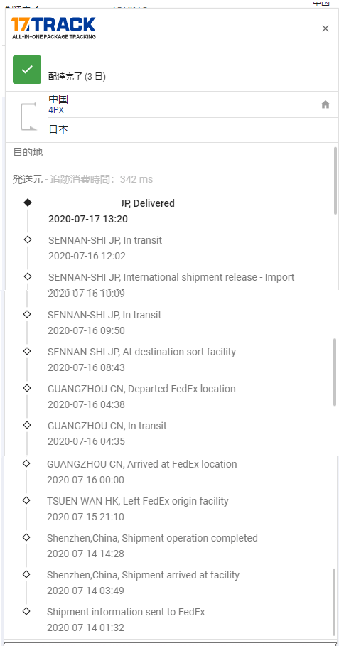 荷物追跡の履歴を見ると、14日に発送され、17日には届いています。